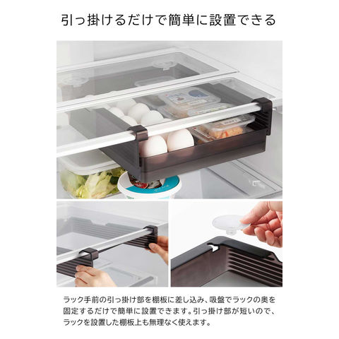 品質表示 ラック:ABS樹脂 引き出し・卵トレー:ポリスチレン 吸盤×2:エラストマー |