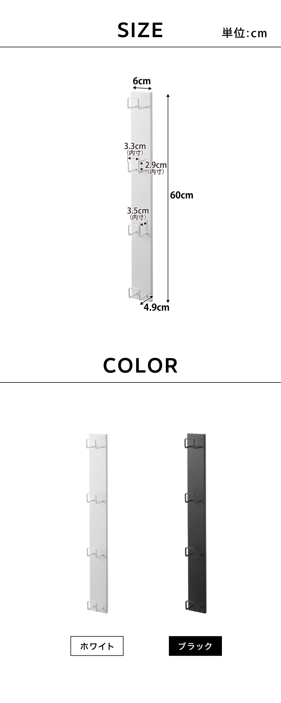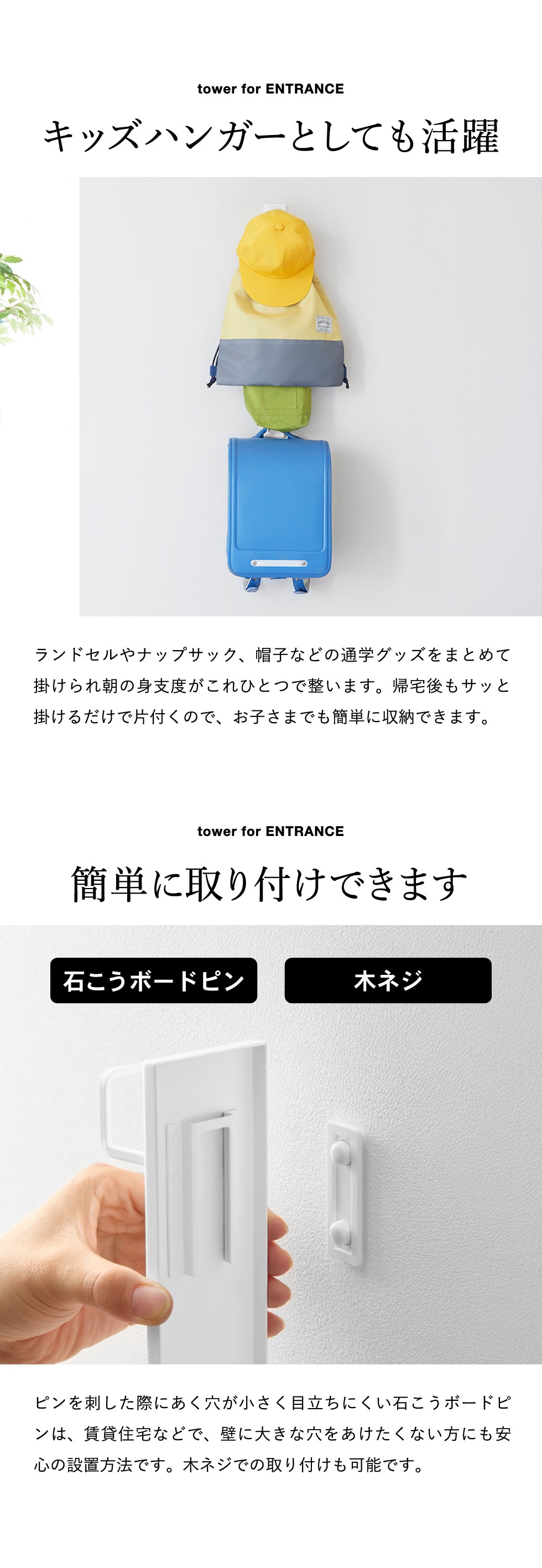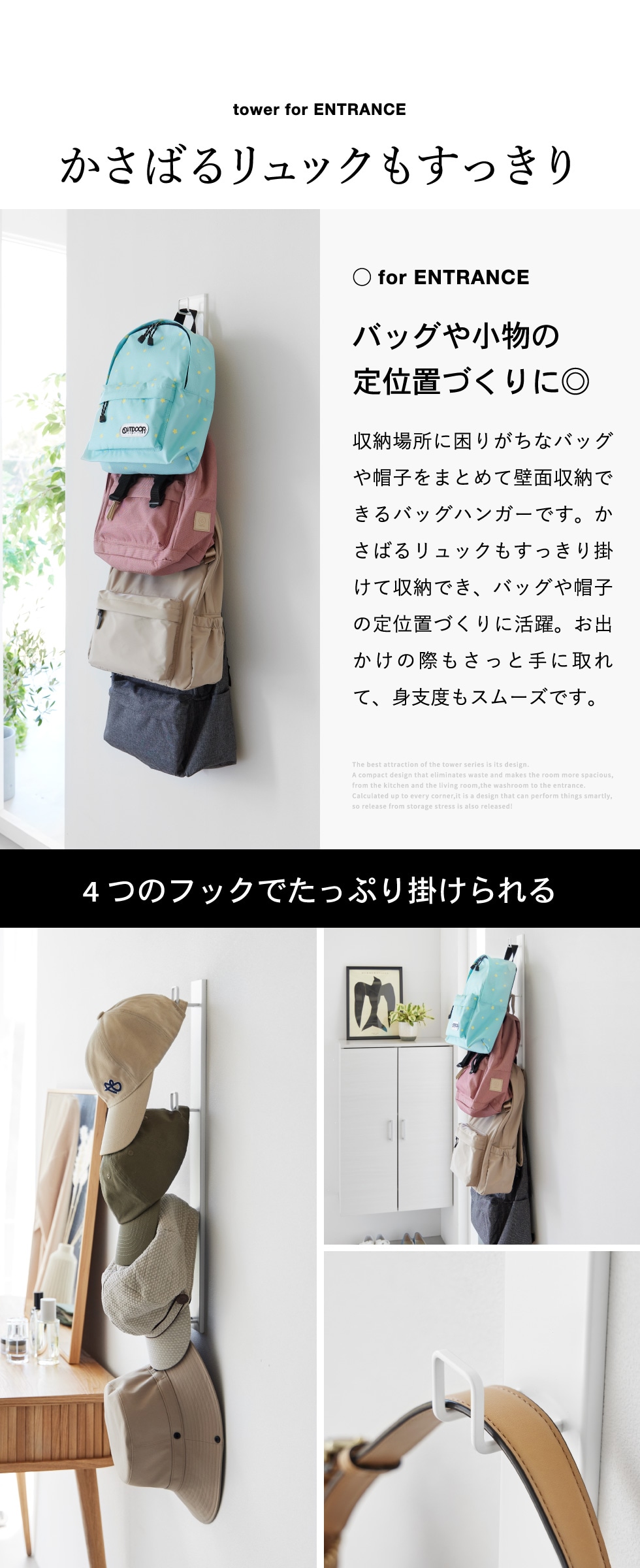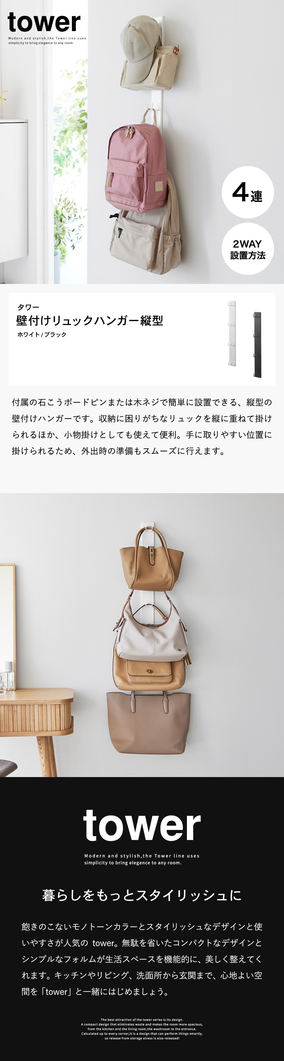 山崎実業 tower 壁付けリュックハンガー タワー 縦型 公式 10579 10580 ホワイト ブラック 送料無料 / 石こうボード壁対応 バッグ収納 カバン掛け 玄関収納 リビング 子供部屋 引っ掛け収納 壁面収納 yamazaki JGS / ブラック