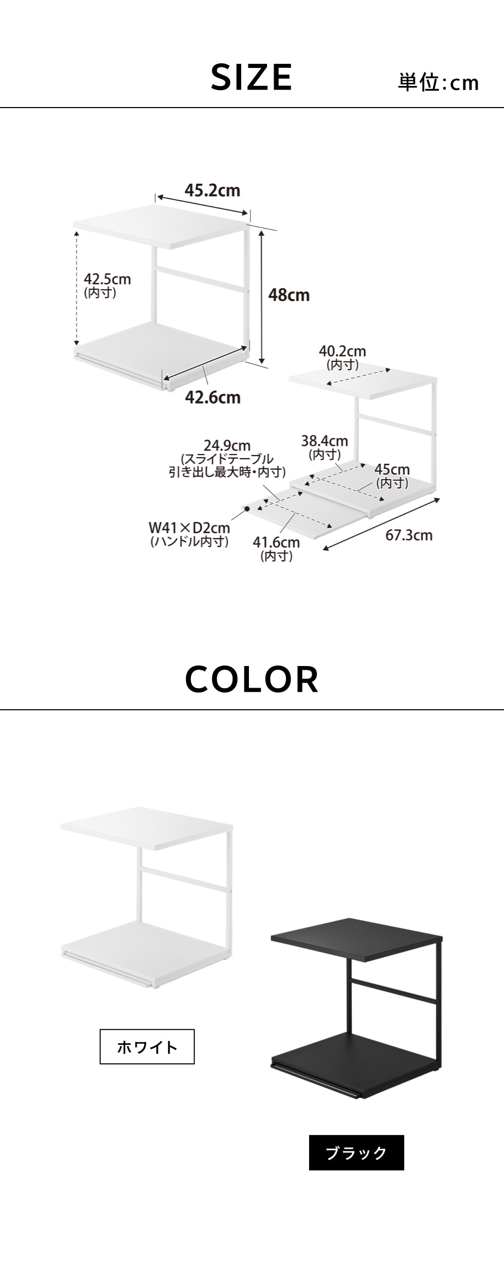 ●内寸サイズ:約 上棚:W45.2×D40.2cm 置き台:W45×D38.4×H42.5cm スライドテーブル:W41.6×D24.9cm(引き出し時最大)