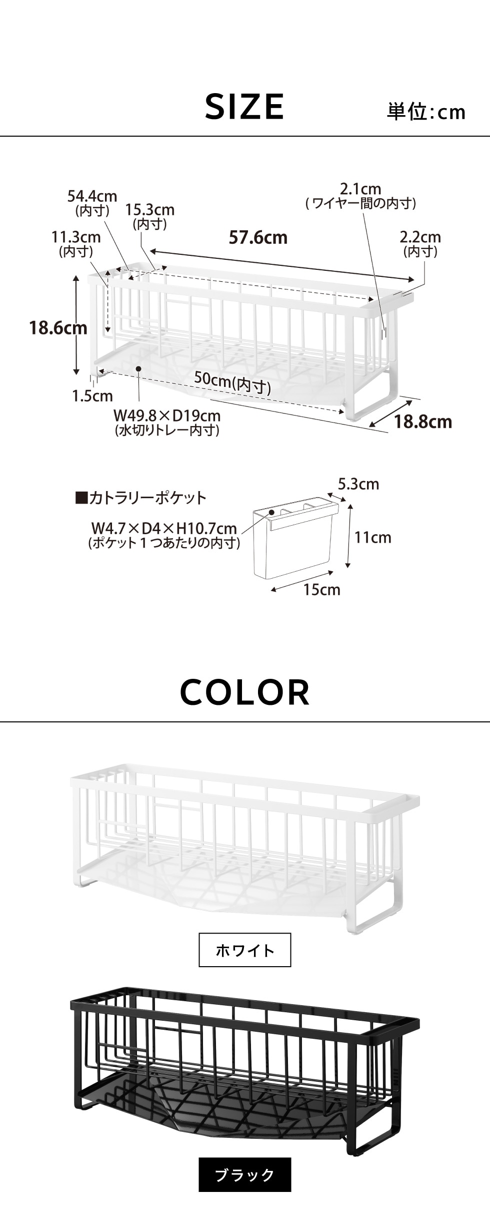 ●商品サイズ: ワイヤーバスケット:W57.6×D18.8×H18.6cm、水切りトレー:W49.8×D19cm