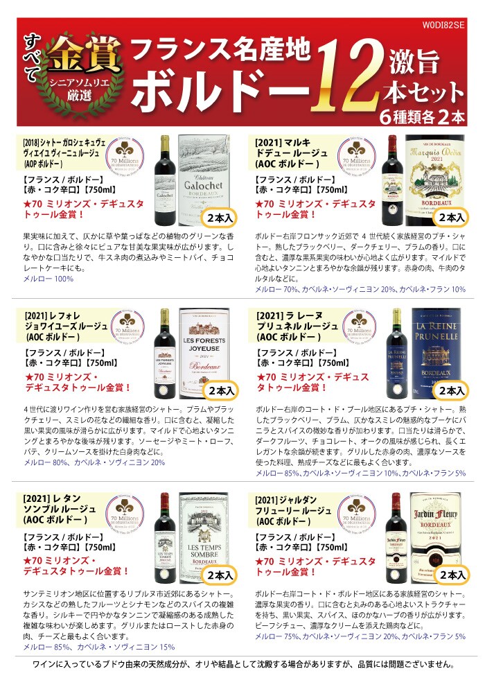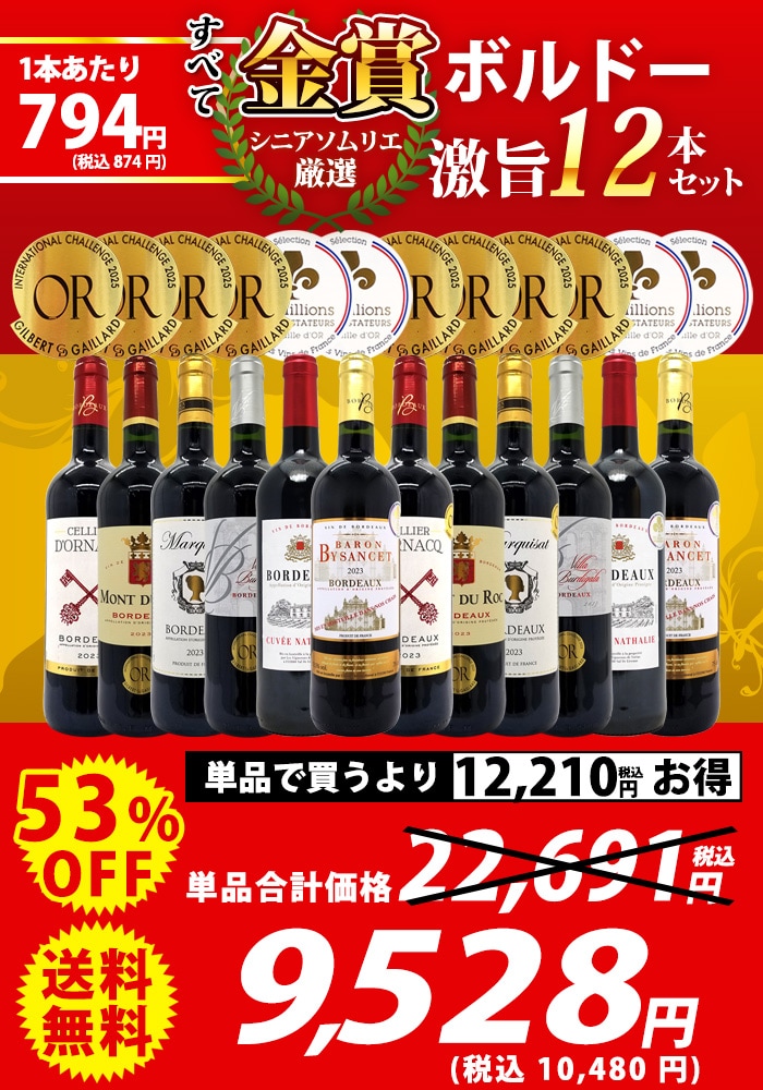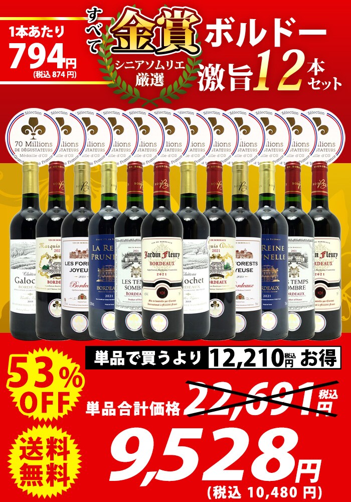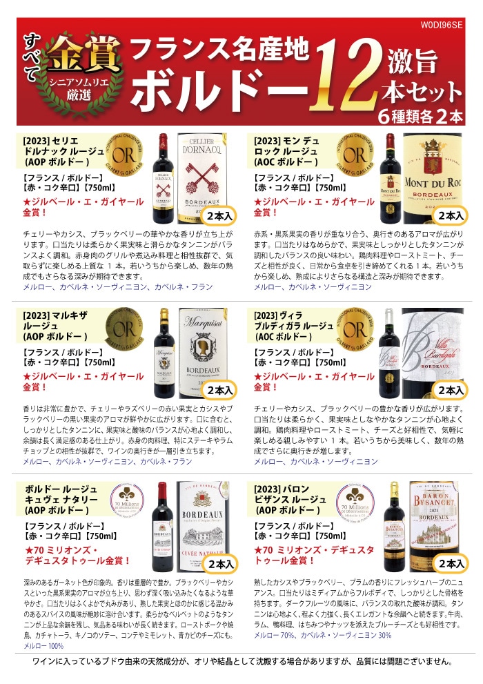 送料無料 ワイン ワインセット すべて金賞フランス名産地ボルドー激旨赤12本セット (6種類12本) ^W0DI96SE^