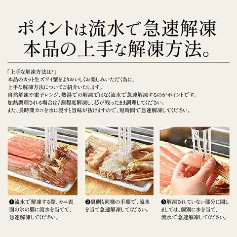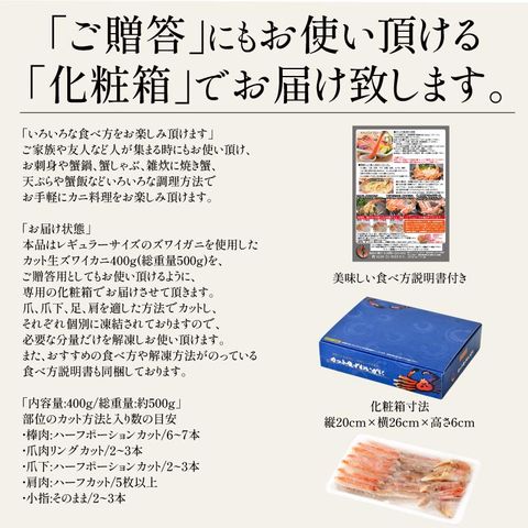 | レギュラーサイズのズワイガニを厳選し、爪、爪下、足、肩など各部位を食べやすくカットしてありますので、 ご家庭で包丁や調理バサミを使用することなく、商品到着後に手間不要でお使い頂けます。 カニは好きだけど捌くのが手間…という方はもちろん、ご贈答用としてもお使い頂けるように専用の化粧箱でお届けさせて頂きます。 |