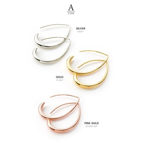 厚みの変わるカーブが女性らしい印象のドロップフォルムのフープピアスは、華奢なデザインながら存在感があり、オケージョンを選ばないので、毎日使いに活躍してくれること間違いナシのマストバイアイテムです。