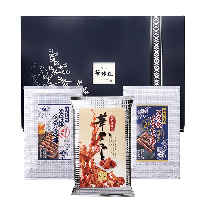 ●内容:華からっと300g×1、博多名物とり皮くるくる串(タレ)108g(7本入り)×1、博多名物とり皮くるくる串(塩)91g(7本入り)×1