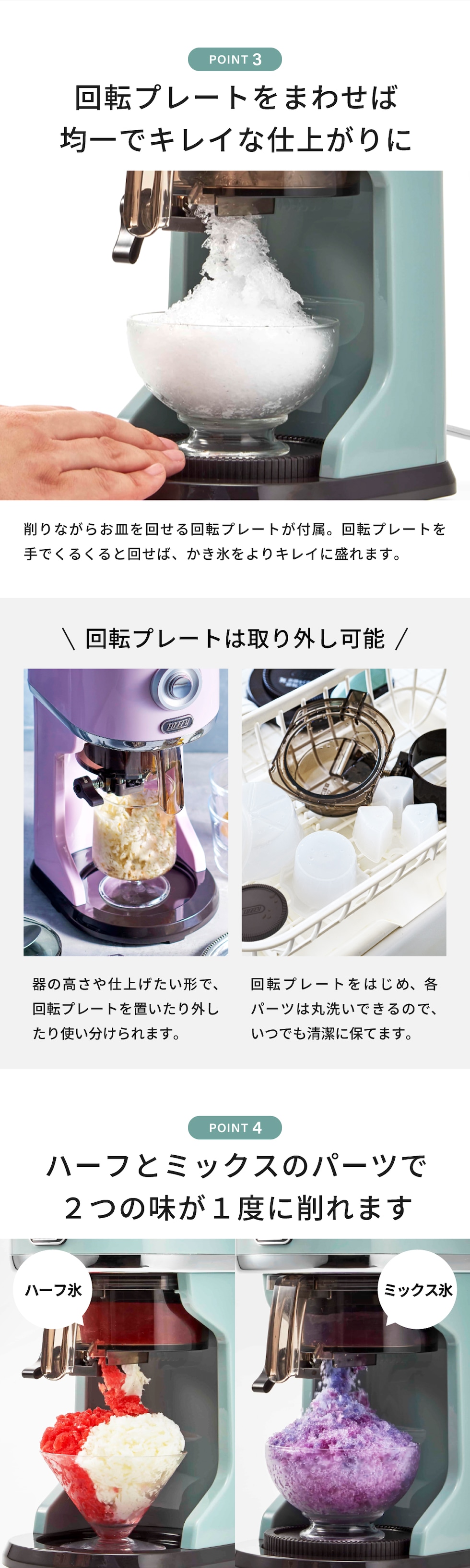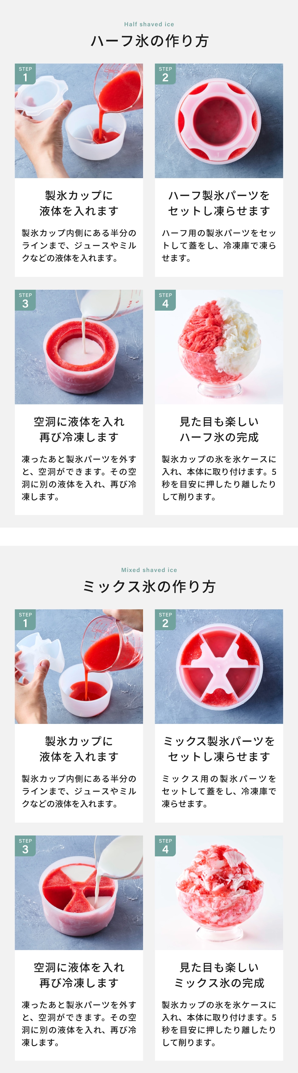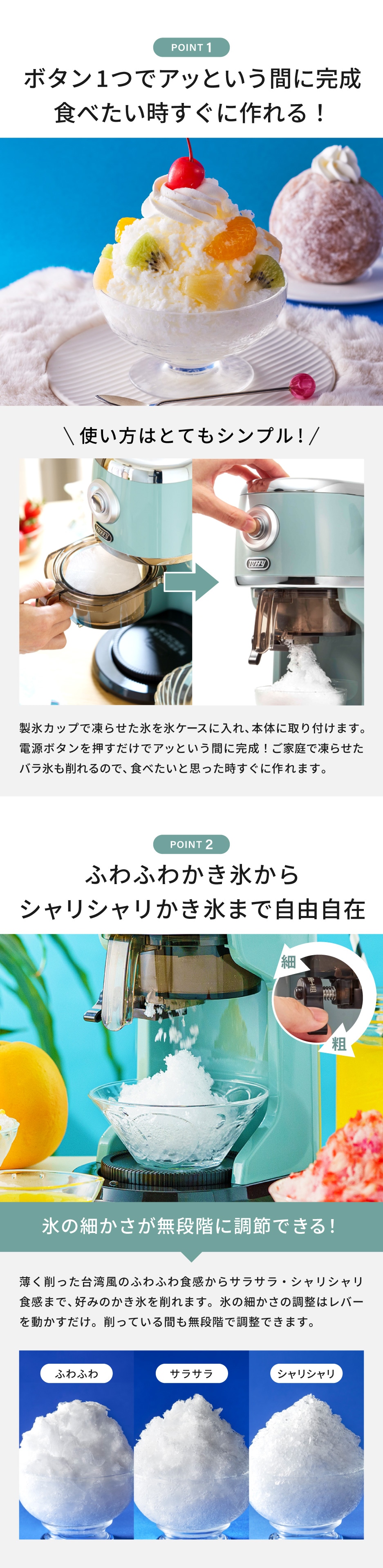 おうちで “かき氷屋さん気分”が味わえる、コンパクトなかき氷器です。電動式でボタンを押すだけの簡単操作。台湾風のふわっとしたかき氷からサラサラ・シャリシャリかき氷まで自由自在。冷凍フル ーツやバラ氷も削ることもでき、アレンジが無限に広がります。