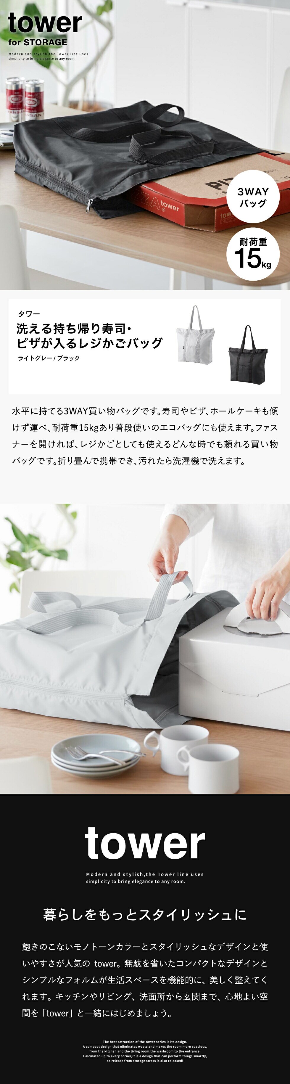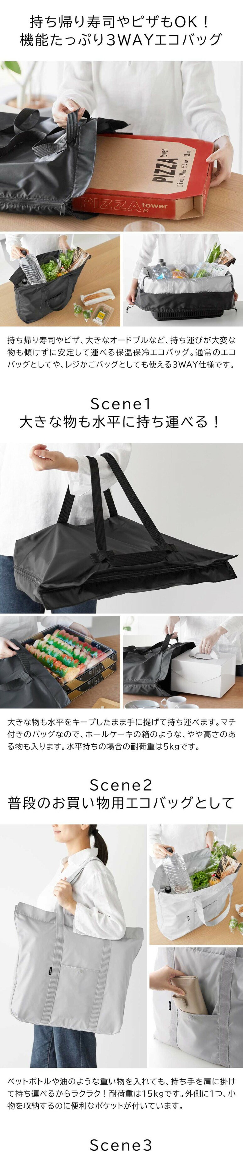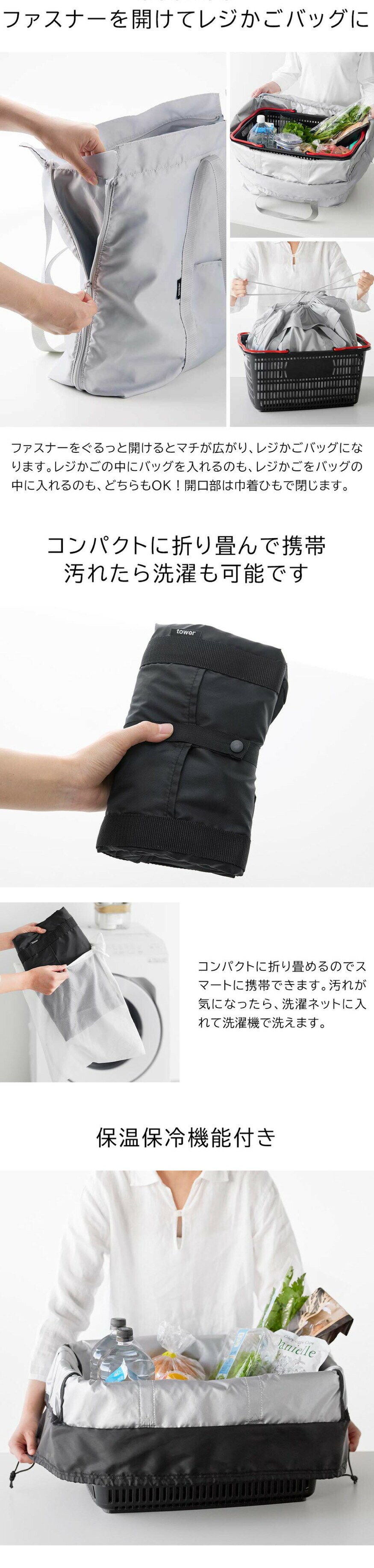 山崎実業 tower 洗える持ち帰り寿司・ピザが入るレジかごバッグ タワー 公式 2125 2126 送料無料 / 収納バッグ 保冷バッグ 保冷保温バッグ 大容量 マチ付き 折り畳み 折りたたみ 3WAY / ブラック