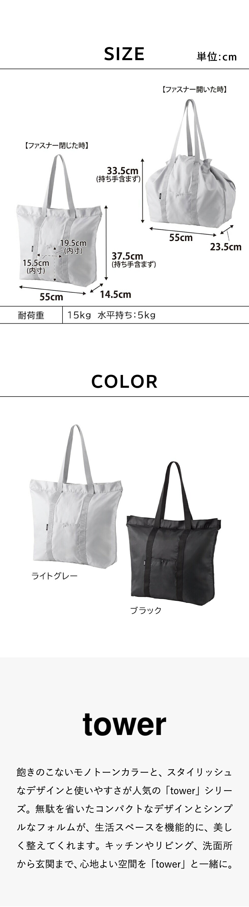 商品サイズ ファスナー閉じた時:W55×D14.5×H37.5cm(持ち手含まず) ファスナー開いた時:W55×D23.5×H33.5cm(持ち手含まず) 折り畳み時:W21.5×D5×H15cm |
