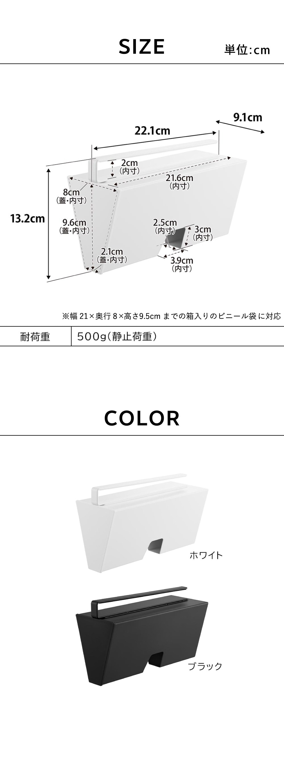 対応サイズ 幅21×奥行8×高さ9.5cmまでの箱入りのプラスチックバッグ ※プラスチックバッグのサイズや形状によって、収納できない場合があります。 |
