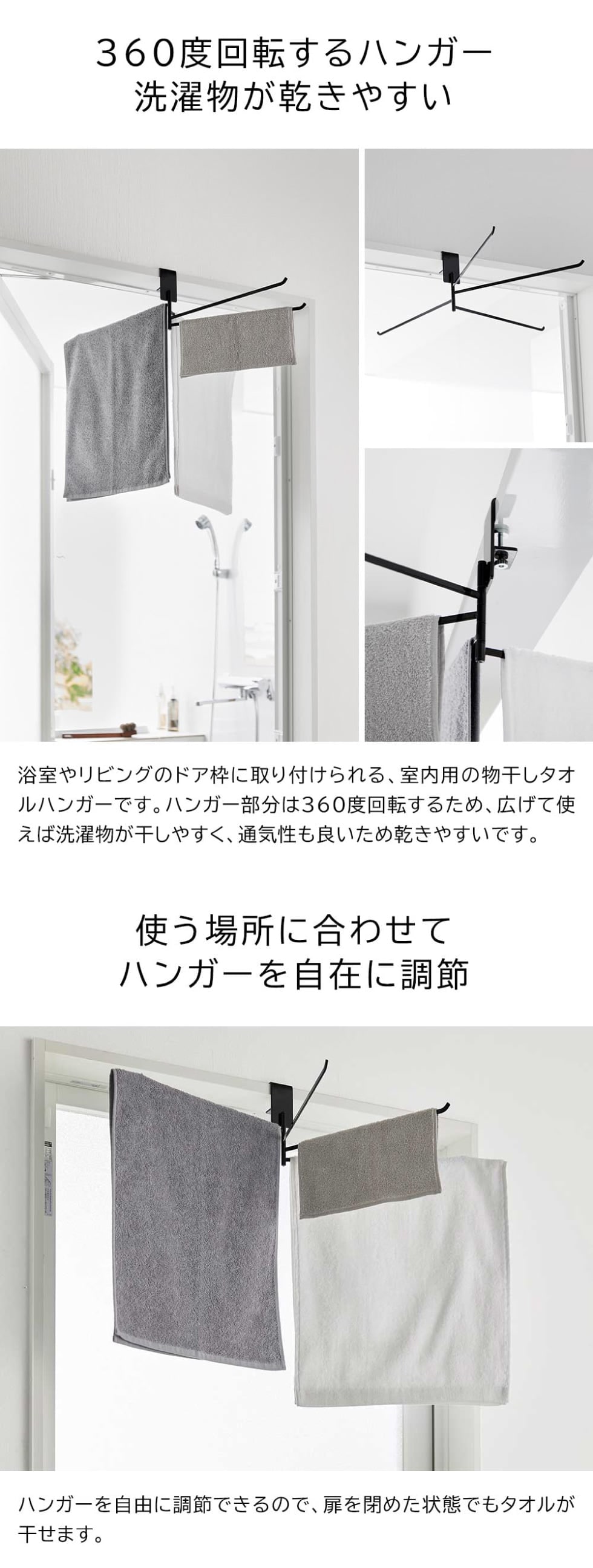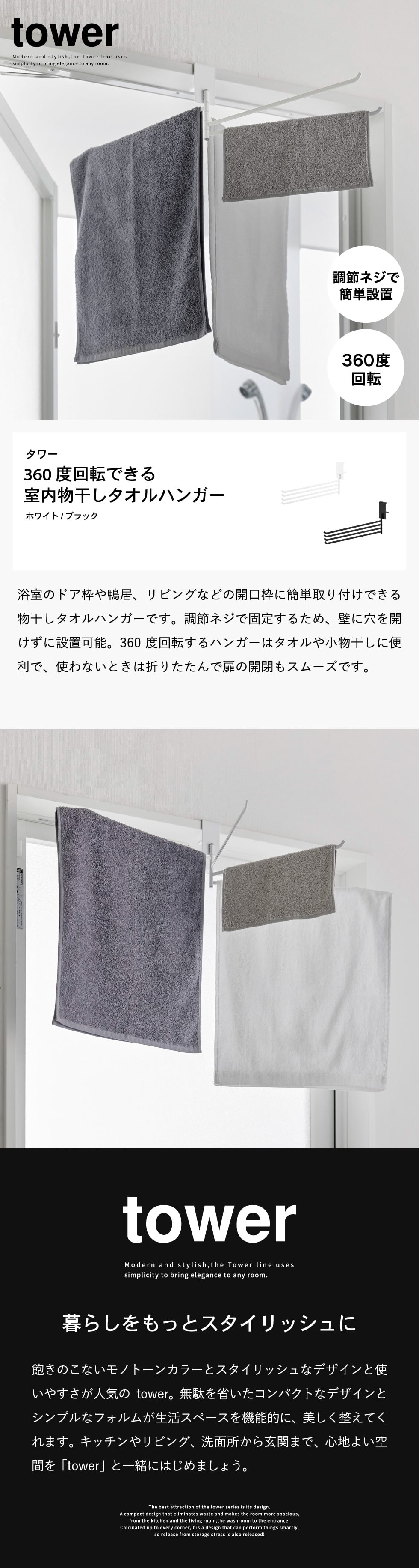 山崎実業 tower 360度回転できる室内物干しタオルハンガー タワー 公式 10322 10323 / 室内干し 部屋干し 洗濯物 折り畳み 浴室扉 洗面所 脱衣所 一人暮らし タワーシリーズ yamazaki / ホワイト