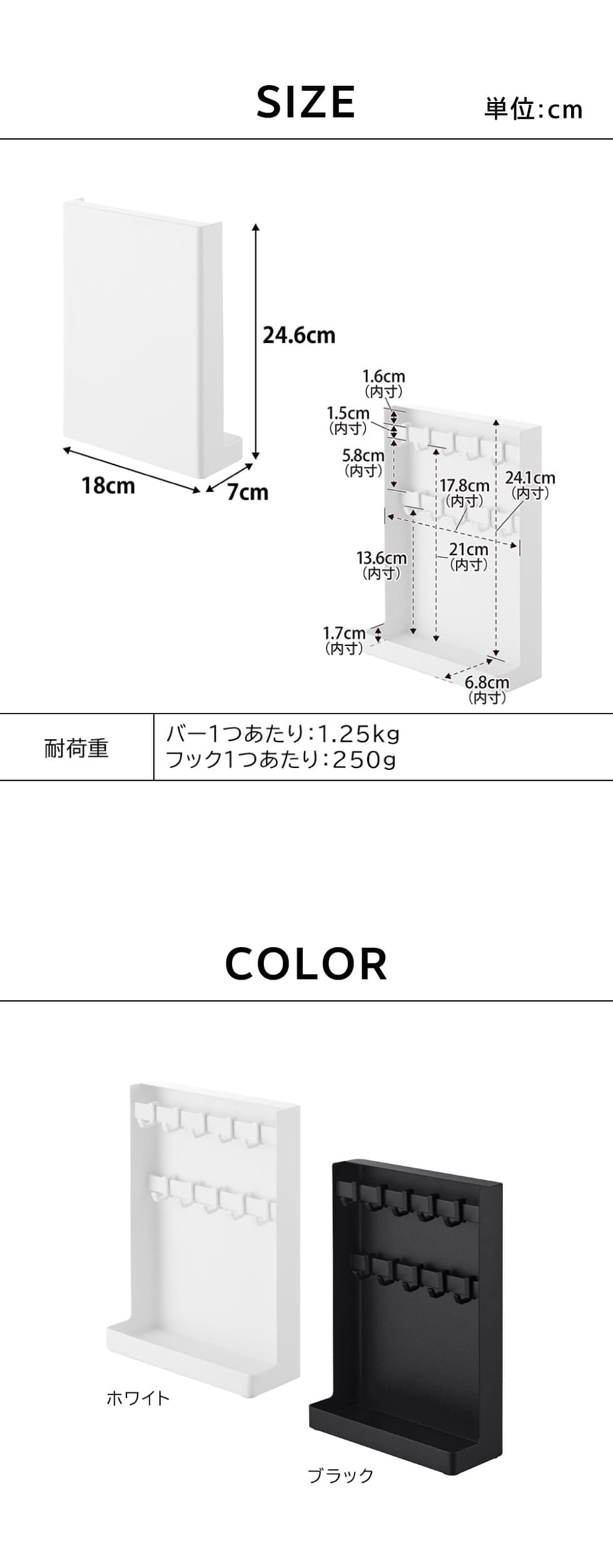 耐荷重 バー1つあたり:1.25kg フック1つあたり:250g (静止荷重) |