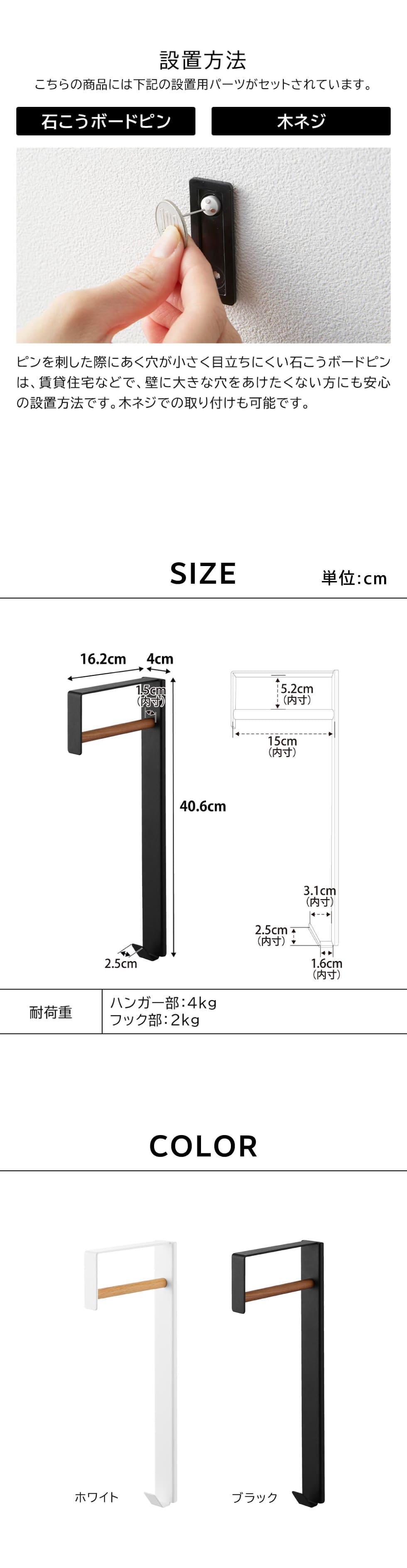 耐荷重 ハンガー部:4kg フック部:2kg (静止荷重) |