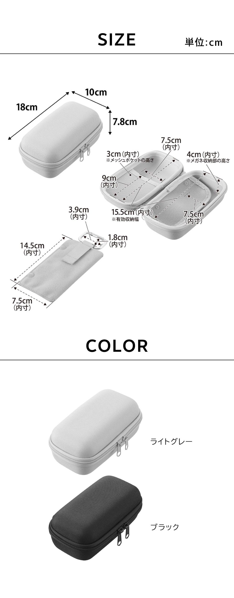 内寸サイズ メガネ収納部:W15.5×D7.5×H4cm メッシュポケット:W9×D7.5×H3cm(有効収納幅:W15.5cm) |