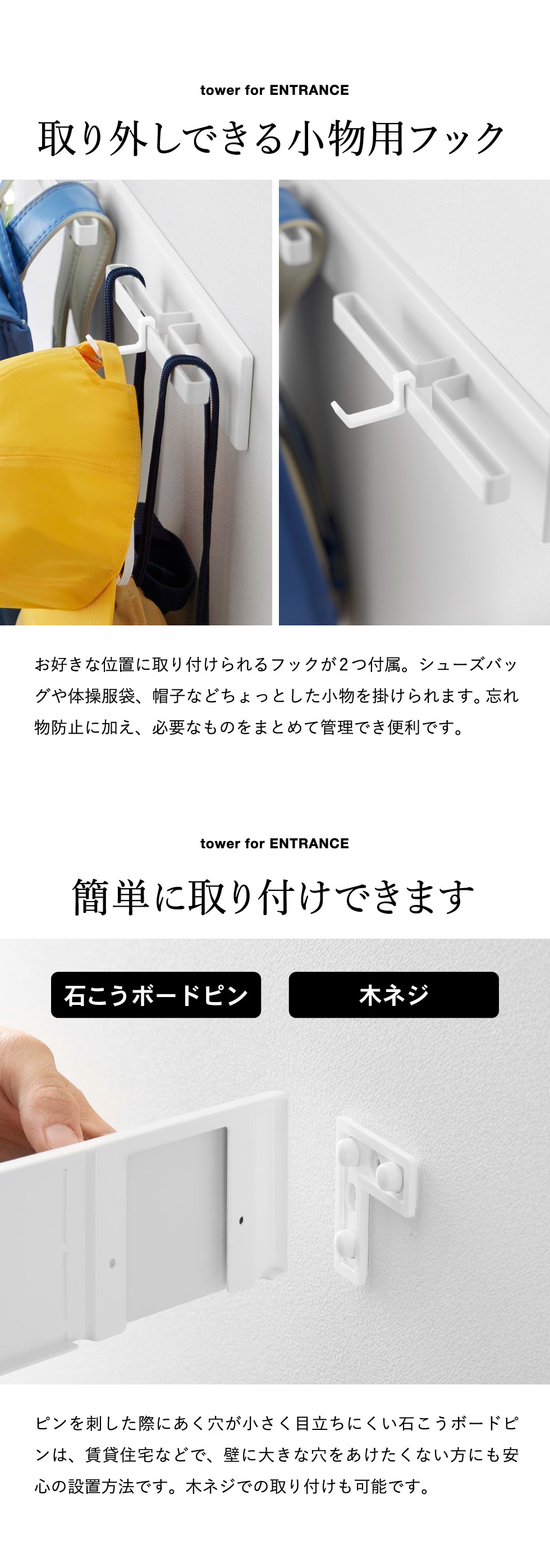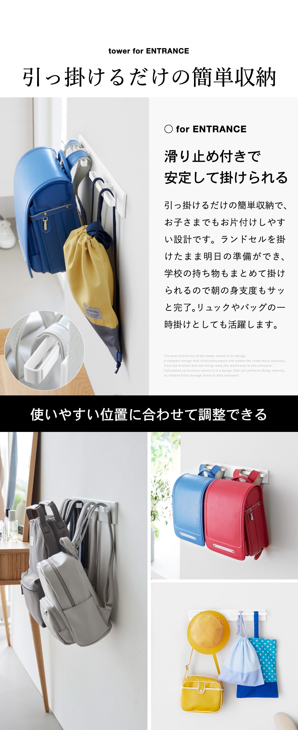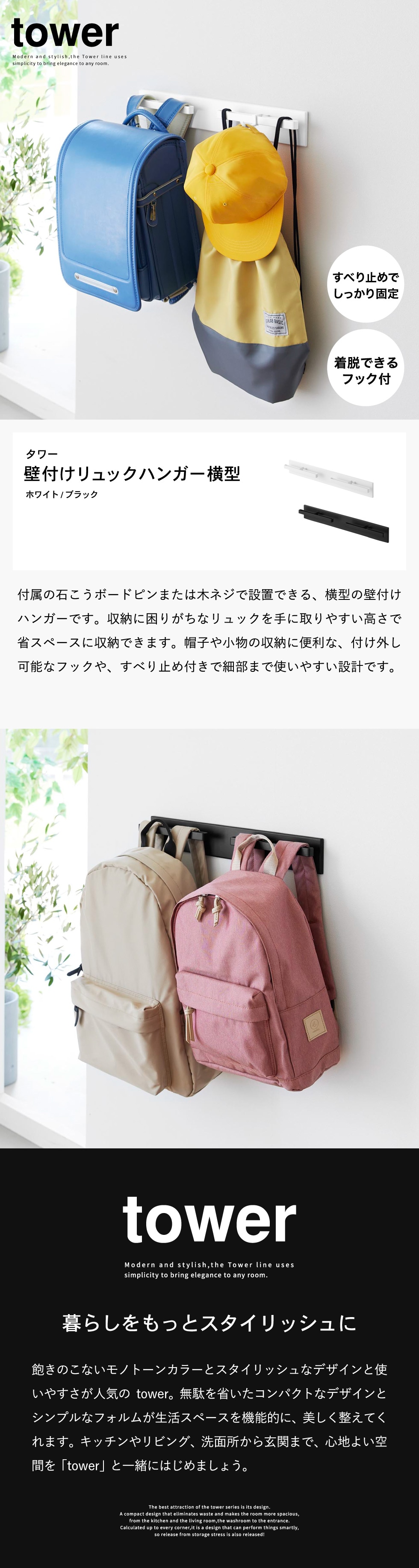 山崎実業 tower 壁付けリュックハンガー タワー 横型 公式 10577 10578 ホワイト ブラック 送料無料 / 石こうボード壁対応 バッグ収納 カバン掛け 玄関収納 リビング 子供部屋 引っ掛け収納 壁面収納 yamazaki JGS / ホワイト