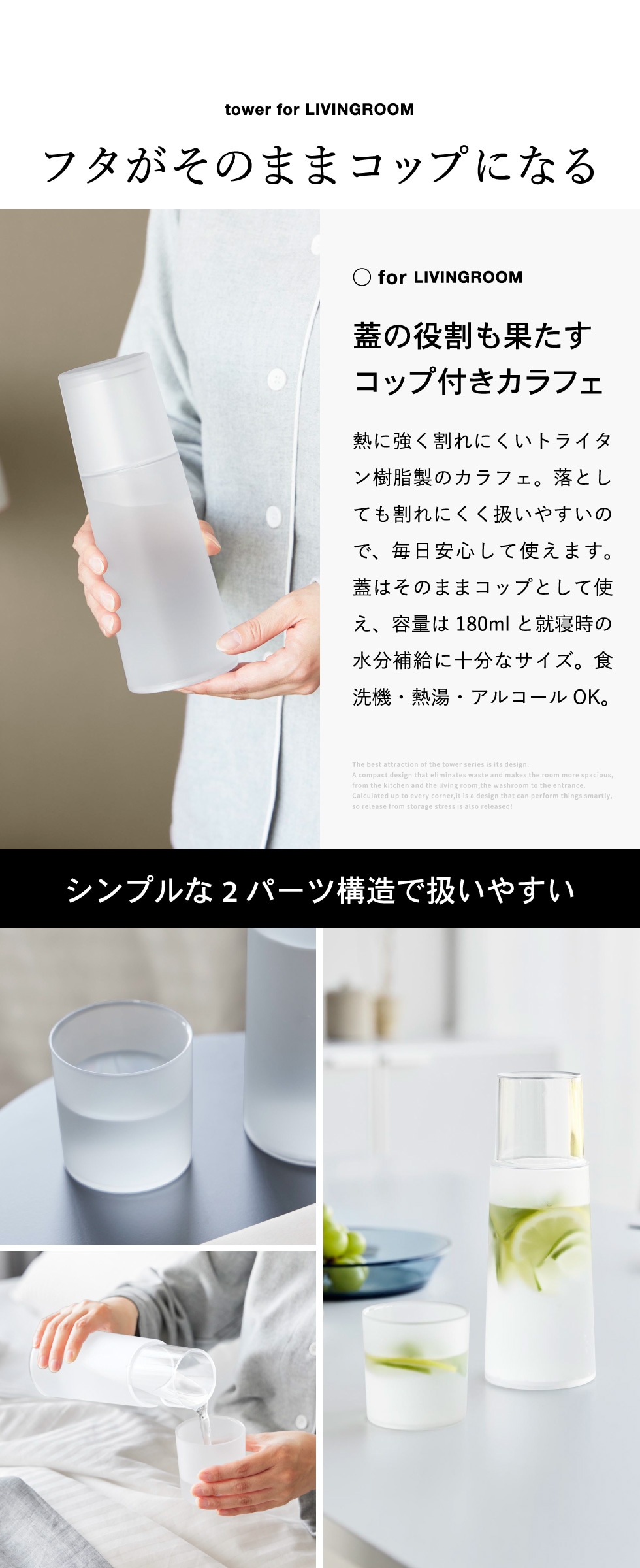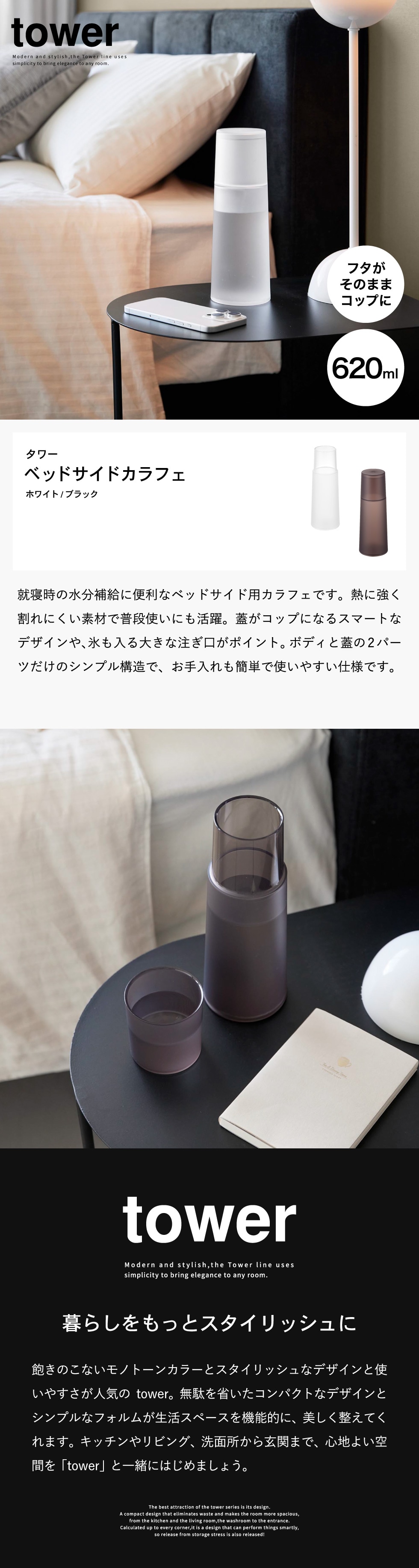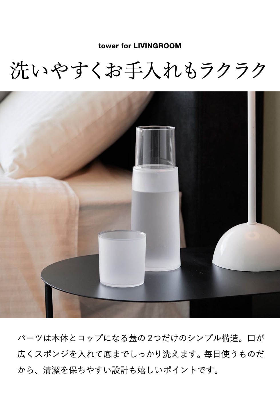 山崎実業 tower ベッドサイドカラフェ タワー 公式 10757 10758 ホワイト ブラック 送料無料 / 620mL ピッチャー ティーポット ボトル 水差し 冷水筒 麦茶ポット コップ付き 食洗器対応 耐熱 寝室 yamazaki JGS / ホワイト