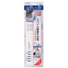 オーム 電源タップ モバイル充電 AC2個口+USB(5個口 1.5m)ホワイト OHM HS-T215UD3-W 【返品種別A】