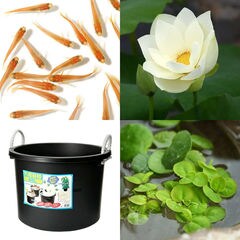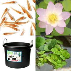 (ビオトープ)(めだか)はじめてのハス栽培セット 桃一重蓮(モモヒトエハス)+万能容器45L+ヒメダカ+浮き草 他 説明書付 本州四国限定